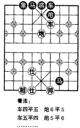 请看循环着法,红方第一着棋车四平五,造成车和炮双照将;第二着车五平四虽然车本身不照将,但它造成中炮又照将。