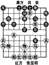 如图,红车塞象服,准备挥炮轰象,黑不能逃象5退3,因红车三进一,炮2平5,车三进二,再吃士杀。这是张亚明对吕钦弈至13回合时的形势,轮到黑方走,决定弃象诱敌。着法如下: