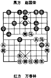 如图是1993年全国个人赛万春林对赵国荣弈至20回合时的形势,轮到黑方走。此时红有车捉炮,黑如逃炮8平3,红借连环马之势炮一平二打车,黑如炮3平8则炮二平五,炮8平3,车六平四,伏炮换双象等兑着。为此黑须通过兑子破除红连环马才能反先,实战着法黑先: