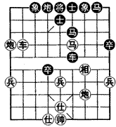 如图形势,红方李来群的右炮威胁对方的底象,车炮马占据要道,一旦发动攻势,黑方将会 被动受攻。红方现在占据着优势地位。红方通过审断局势,决定在运子中弃炮捉车,以扩大战果。红方先行: