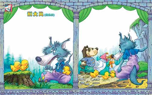 (旁白):大狼领着一群小鸡走向自己的家——山洞,一边走一边还领着小鸡们唱歌:“风刮吧!风刮吧!躲进山洞不怕风!”